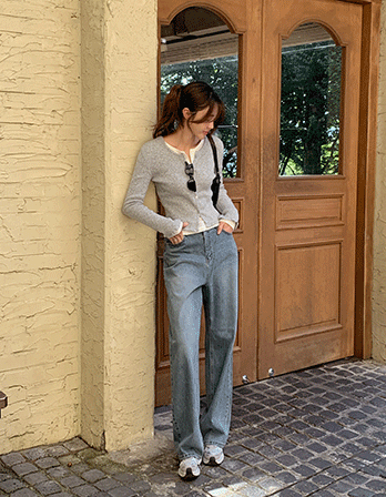 - 전체적으로 노란끼가 돌아 빈티지한 무드로 연출되는 데님이예요 세미와이드핏으로 트렌디하고 쨍한 컬러감의 팬츠들 보다는 훨씬 부드럽고 세련된 모습이예요♡