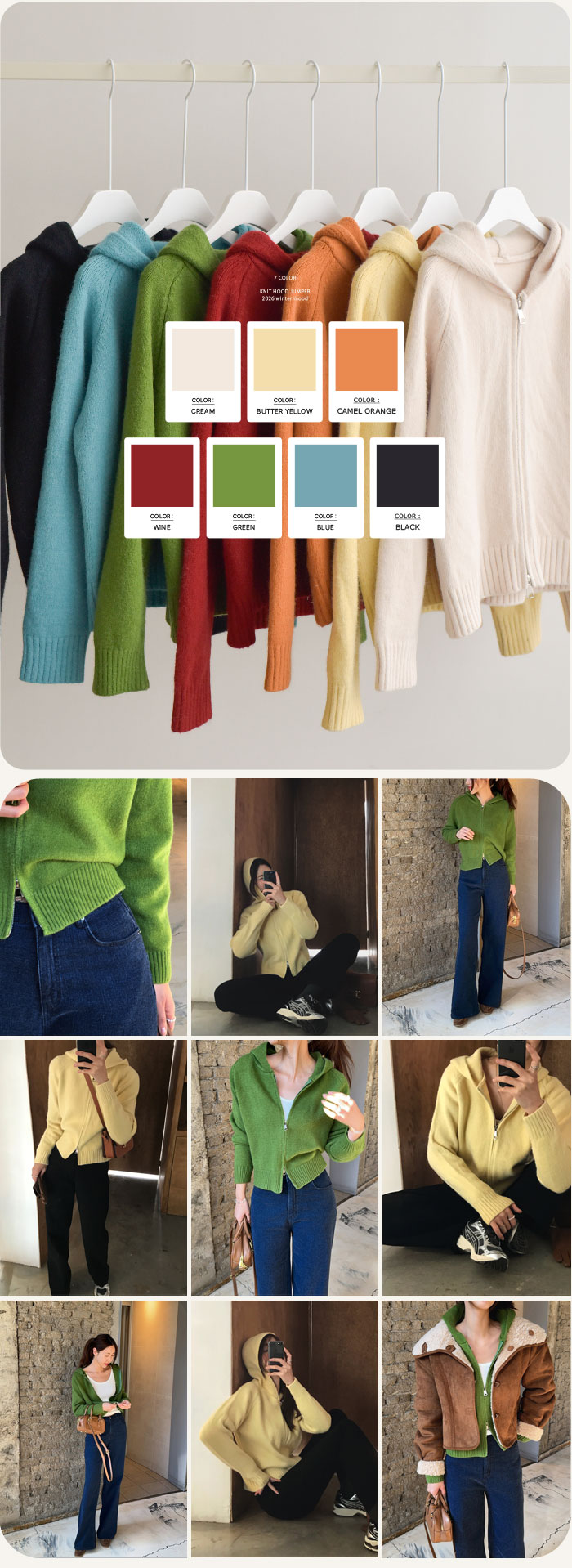 크림,버터옐로우,와인,그린,카멜오렌지,블루,블랙