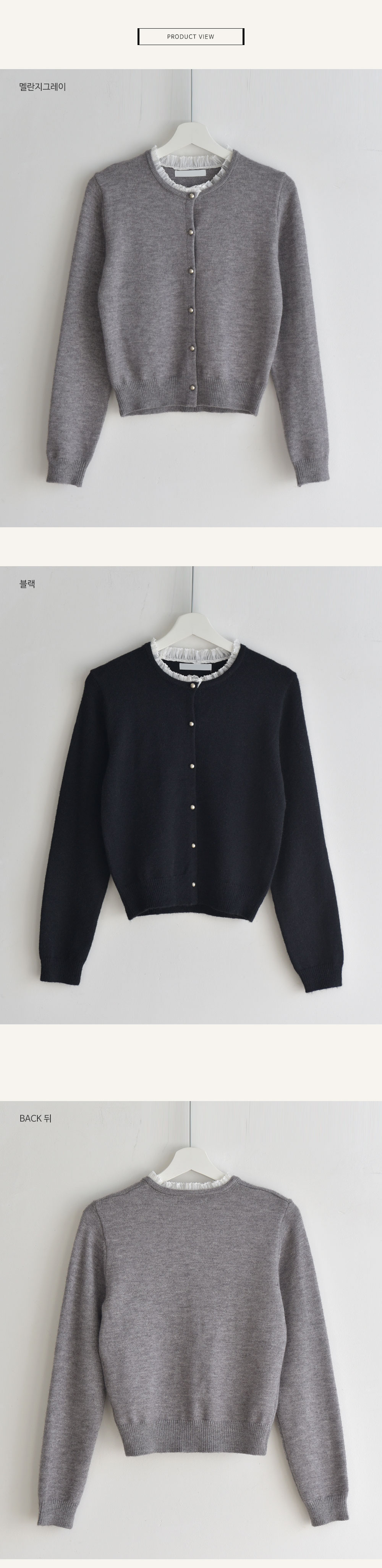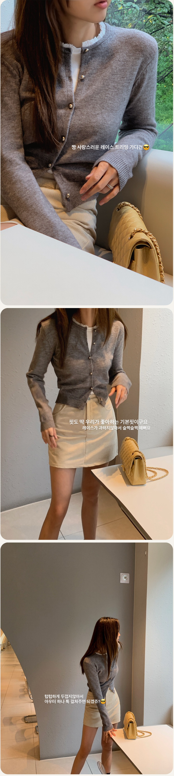 넥라인의 레이스가 여성스러운 무드로 연출되는 가디건