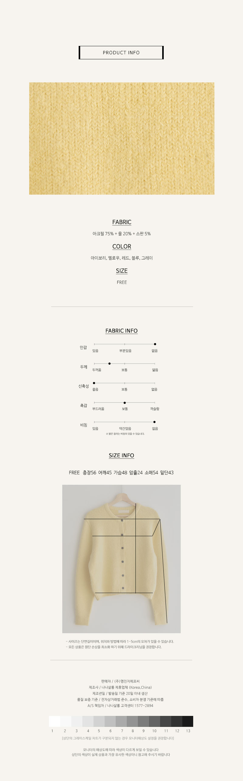 울20% 아크릴75% 스판5%가 블렌딩된 원단이예요 굵은 짜임의 니트가디건으로
