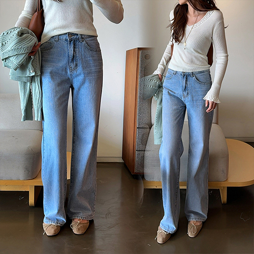 물빠진듯 희끗한 컬러로 멋스럽게 연출되는 와이드핏 데님팬츠예요