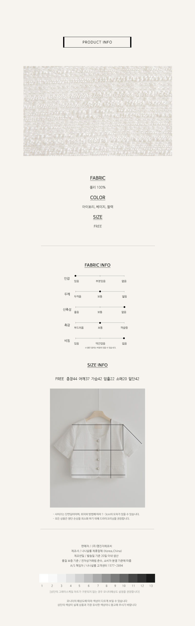 폴리 100% 원단이예요 얇은 트위드 조직감의 원단으로 안감이 덧대어져 있어