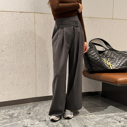 허리라인의 랩 형식의 디테일이 들어간 슬랙스로 포인트를 주기 좋아