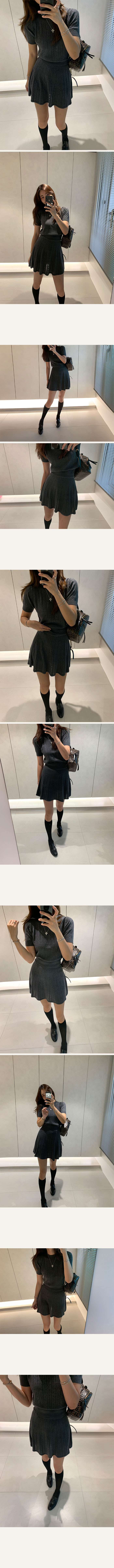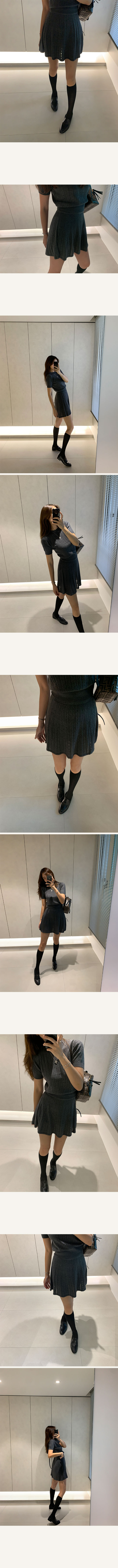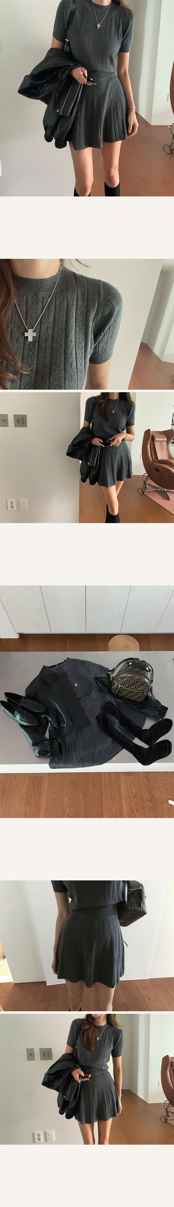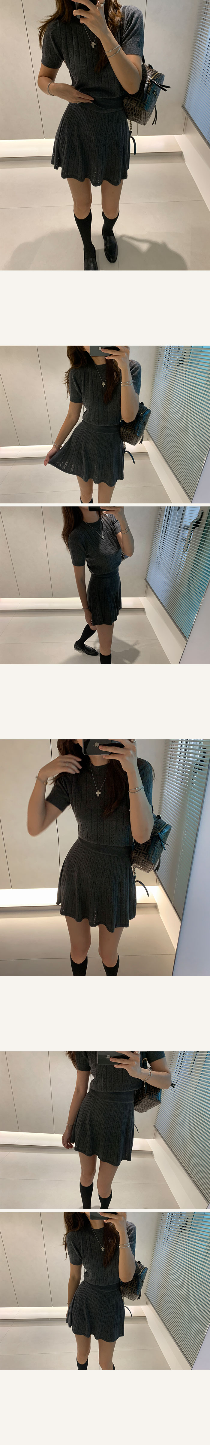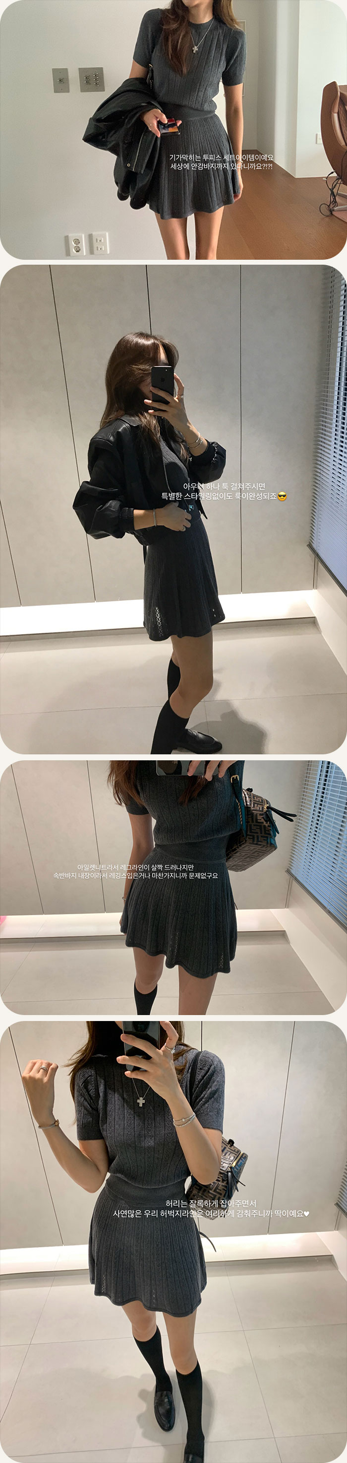 상의는 라운드넥의 반팔 니트, 하의는 미니기장의 플레어핏