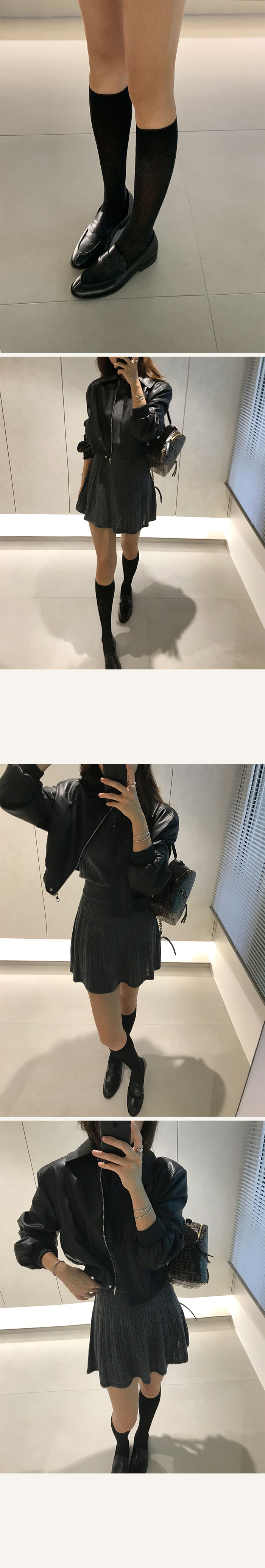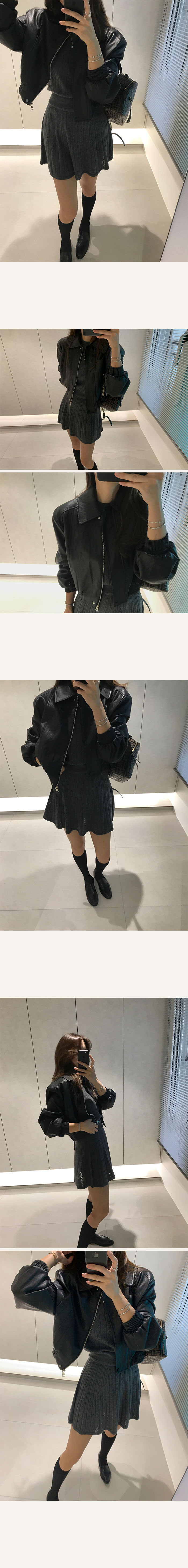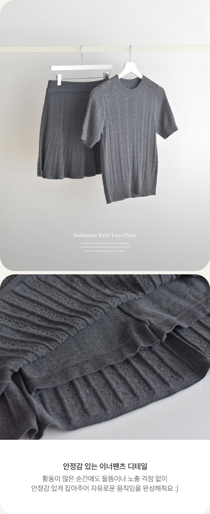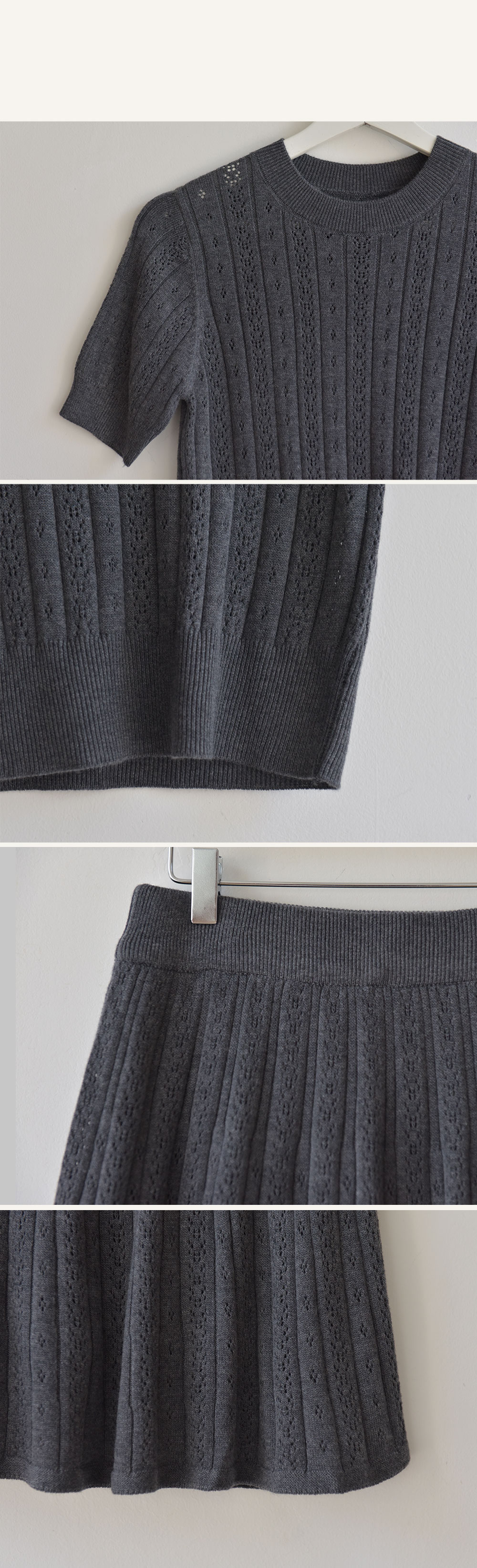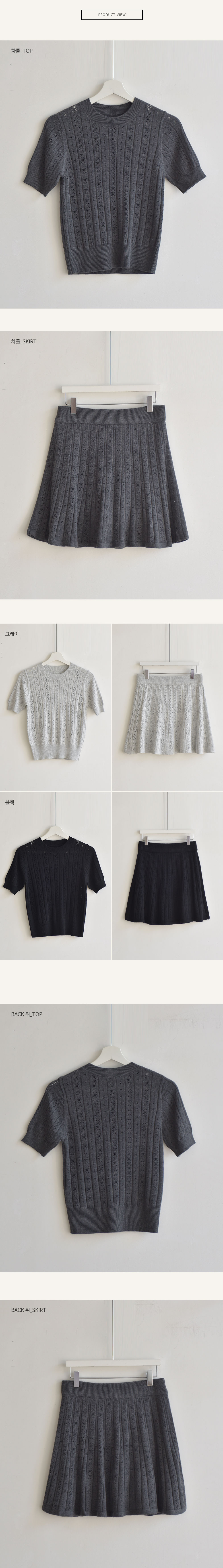 상의는 라운드넥의 반팔 니트, 하의는 미니기장의 플레어핏